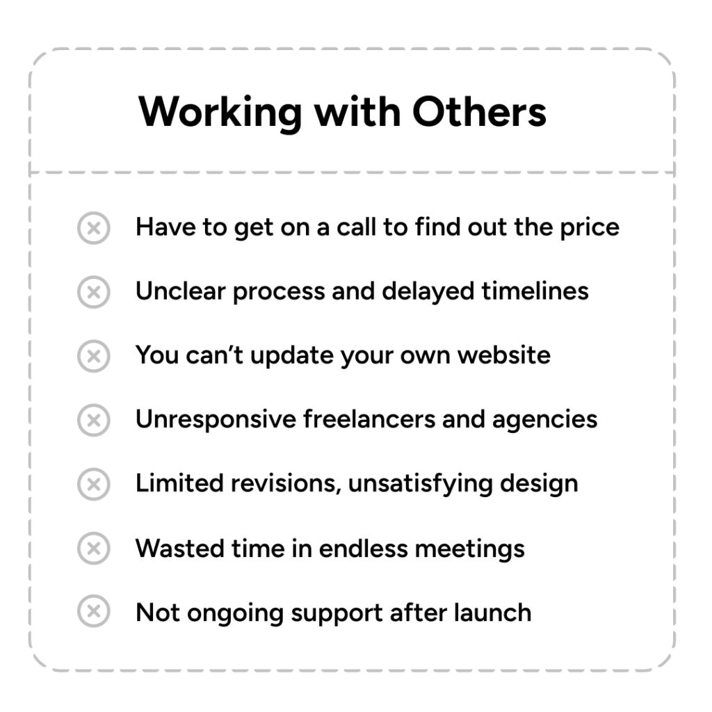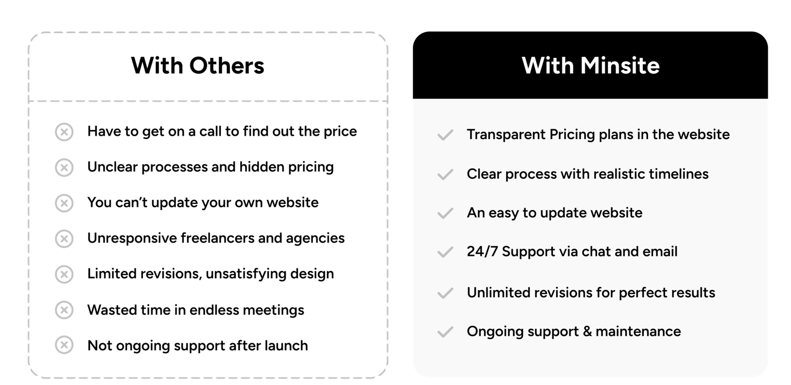 Skip the hiring delays of agencies and freelancers. With Minsite you will start seeing results in days, not weeks.